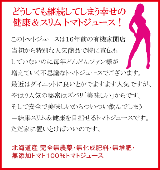 ○名称:トマトジュース ○原材料名:トマト(北海道仁木産) ○内容量:160ml×6本 ○賞味期限:1年 ○製造者:江本自然農園 ○生産地:原材料収穫・ビン詰め加工は全て北海道 *手作業のため容量にバラつきがあります、ご了承ください。 お母様が一口飲まれると そのコクのある甘さに 優しい美味しさに 今日の一日の疲れや嫌なことが スーと消えることでしょう。 そんな不思議な 完熟トマトジュースです。 ...