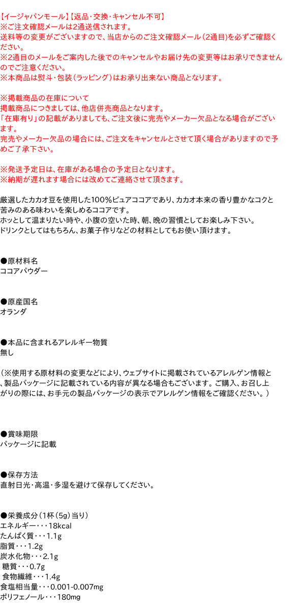厳選したカカオ豆を使用した100%ピュアココアであり、カカオ本来の香り豊かなコクと苦みのある味わいを楽しめるココアです。ホッとして...