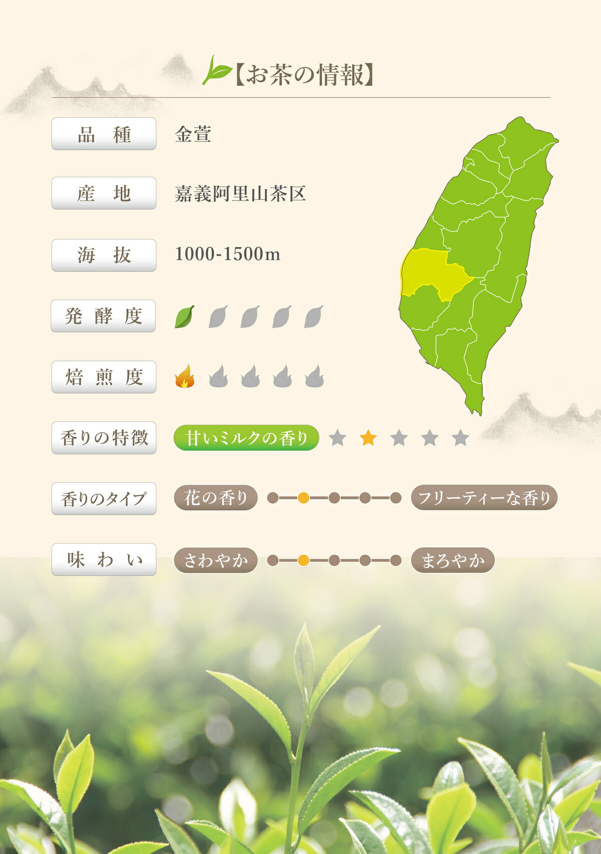 ミルクを思わせる甘くやわらかな香りと、みずみずしい余韻の心地よいお茶です。 台湾の金萱茶は、天然の茶葉からミルクのようなやわらかな香りの広がるお茶です。 爽やかなはずのお茶からミルクの風合い?と聞くと、少し不思議に感じられるかもしれません。 でも、このやわらかな香りに虜になるお茶好きさんが多いんです。 「ミルク」や「松の実」を思わせる香り良いお茶を飲み干すと、舌のつけ根に甘い感覚が広がって。 高山...