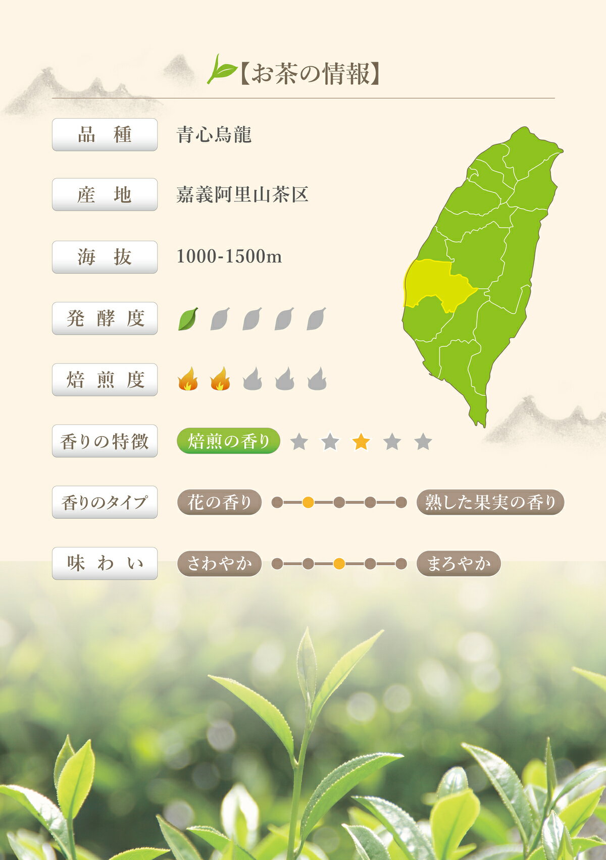 阿里山に位置する石棹は、東北向きの茶園では十分な日照を受け、周囲の杉木林のおかげで適度な湿度を保っています。 茶園では有機質肥料を使用し、丁寧に管理されることで、豊かで深みのある味わいが生まれます。 ●金色がかった緑色の茶湯 ●口に含むと、広がる上品な金萱の香り ●喉越しに感じられるサトウキビの甘い香り ●発酵度18%で軽やかな味わい 商品情報 名称 阿里山金萱茶 内容量 150g 原材料名 茶葉...